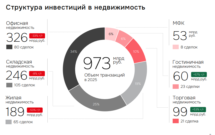 Но есть особенность — недвижимость реагирует на инфляцию с некоторым запозданием. Исключение — жилая недвижимость, цены на которую растут вместе с ценами на продукты. В частности, именно поэтому инвестиции в квартиры по объему занимают третье место в структуре общих транзакций, и это несмотря на колоссальную просадку ипотеки, которая повлияла на рынок в 2025 году.
