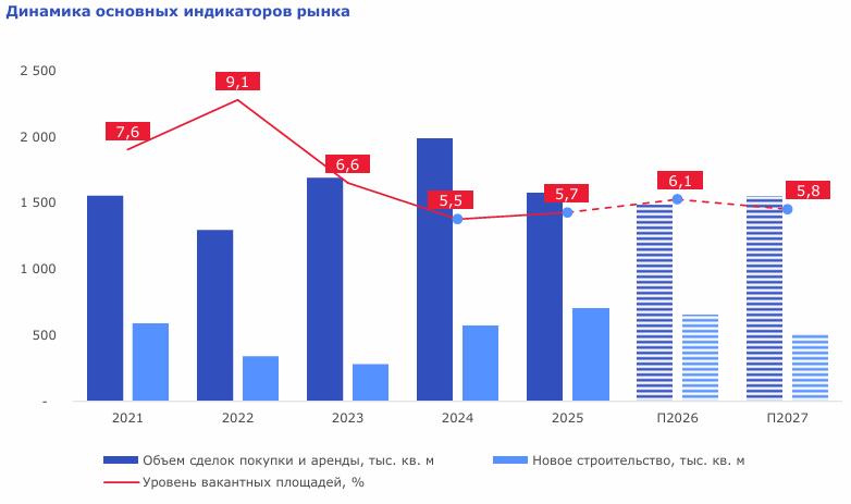 Предложение сузилось еще больше, когда в результате роста ключевой ставки девелоперы стали откладывать сроки сдачи новых бизнес-центров: в 2025 году ввод в эксплуатацию в целом по рынку запаздывал не меньше, чем на год (доля «переносов» стала рекордной — 48%, отмечает Nikoliers). При этом значительная часть общего объема офисных помещений строится под конкретного покупателя и, как следствие, уже продана. Все эти факторы формируют низкий показатель вакантности офисов, на начало 2026 года равный 5,7%, а в течение года доходивший 5,4% — минимального значения за шестнадцать лет.