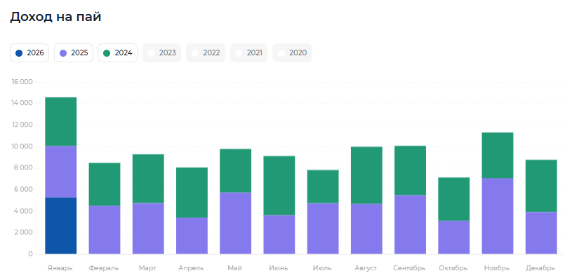 Диаграмма позволяет сопоставить ежемесячные выплаты дохода на пай в фонде «Активо десять». В состав имущества фонда входит супермаркет «Перекресток» в Москве