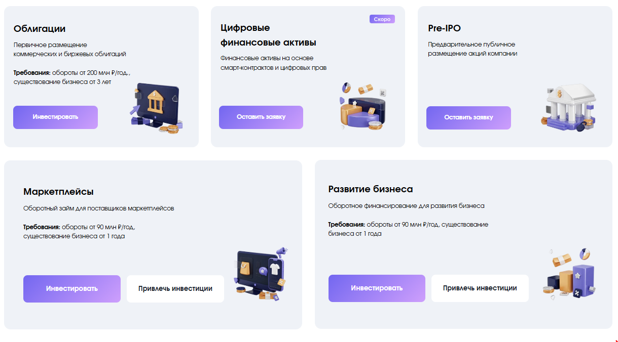 В настоящее время в отдельный тип выделены займы поставщикам маркетплейсов. Кроме того, компании получили возможность провести первичное размещение облигаций или Pre-IPO (а инвесторы — приобрести внебиржевые корпоративные облигации), в планах — работа с ЦФА.