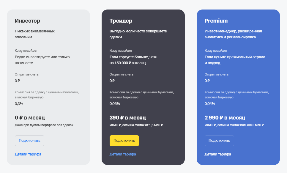 У брокера есть три тарифа — «Инвестор», «Трейдер» и Premium.