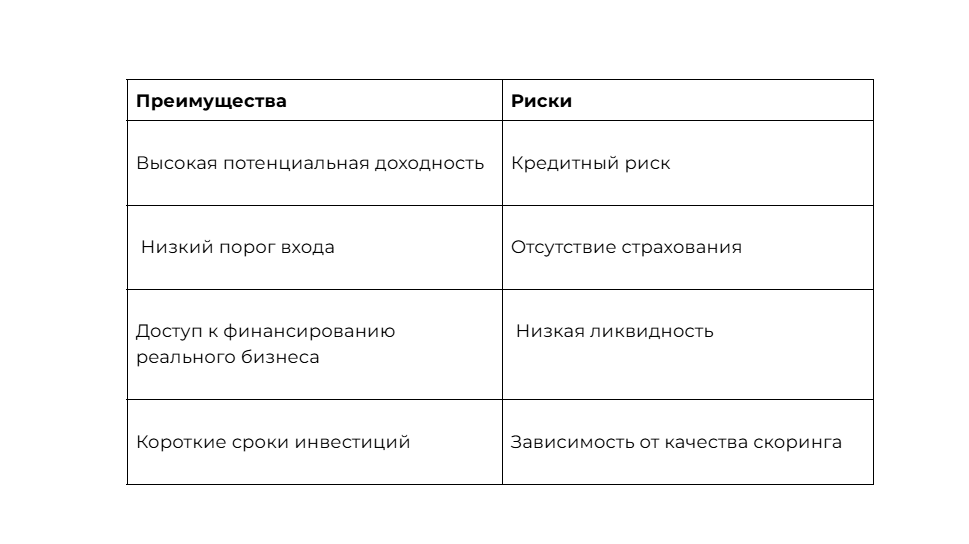Краудлендинг — это высокодоходный, но рискованный инструмент инвестирования. Инвестиции не застрахованы, процесс взыскания задолженностей может длиться долго, ликвидность вложений чаще невысокая. Основной риск — невозврат займа, т.е. дефолт: компании малого и среднего бизнеса, являющиеся основными заемщиками на инвестиционных платформах, банкротятся чаще, чем крупные корпорации.