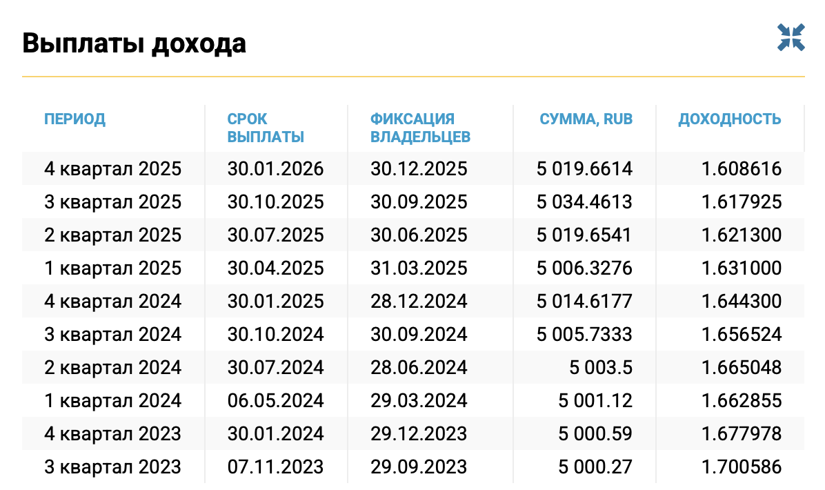 Выплаты пайщикам осуществлялись раз в квартал. Для инвесторов, купивших паи ЗПИФ «Арендный поток-2» в период первичного размещения, средняя годовая доходность составила ~6,6% по данным, опубликованным на сайте investfunds.