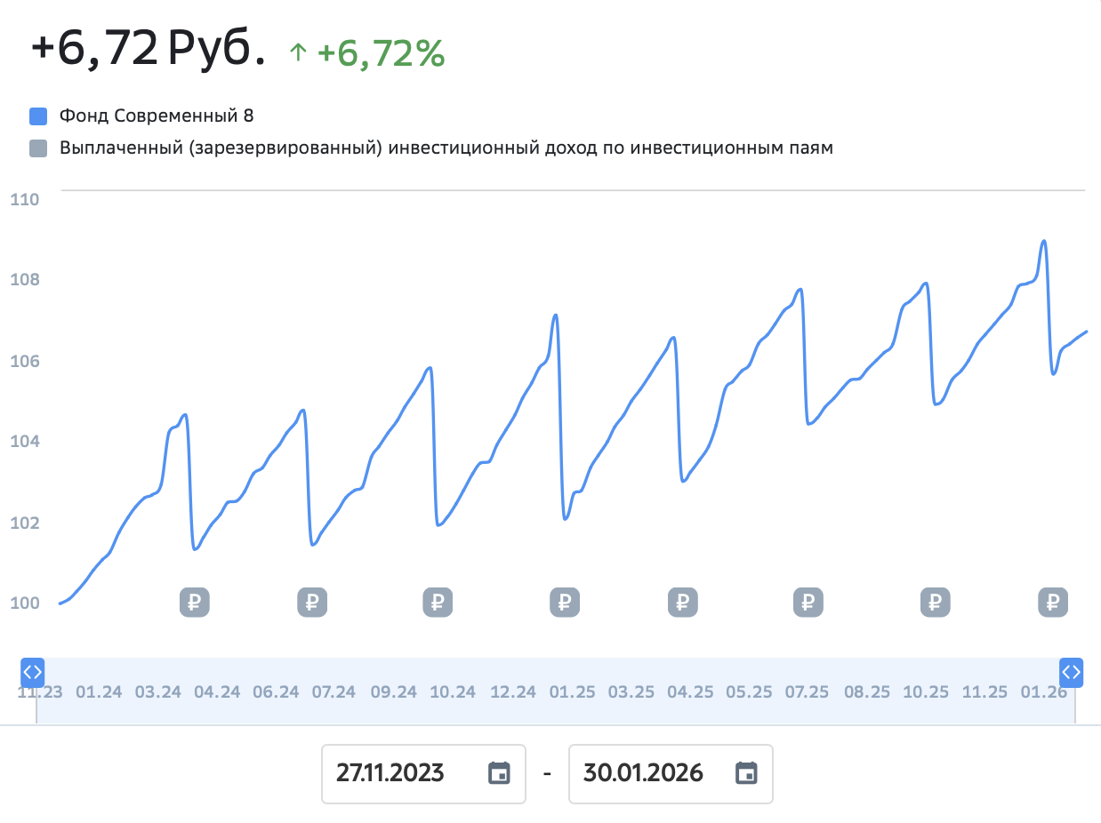 В феврале 2026 г. расчетная стоимость пая составляет 106,71 ₽. Более чем за год стоимость пая выросла на 2,6%, с начала формирования фонда — на 6,7%.