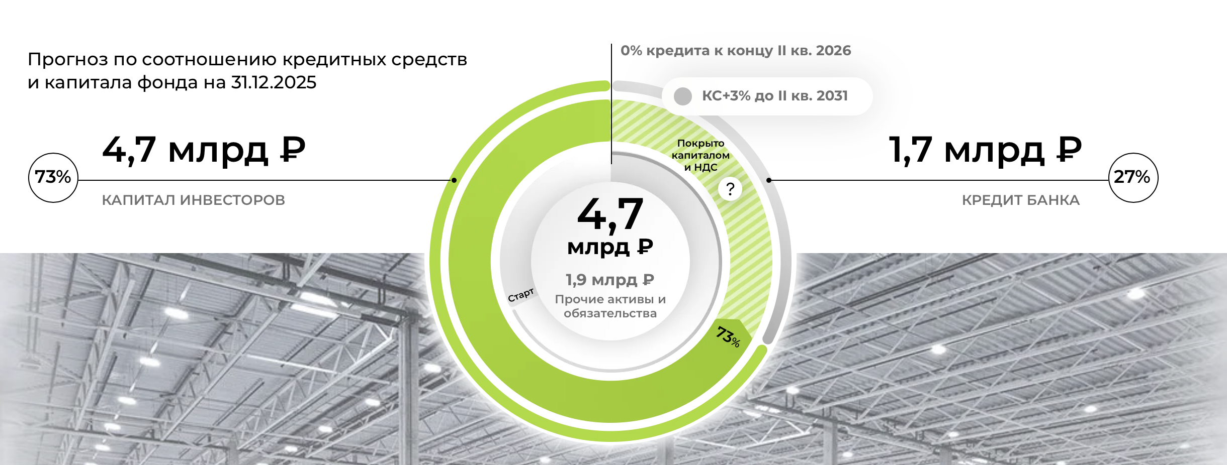 Особенность фонда — наличие кредитного плеча в размере 1,7 млрд ₽. Однако этот кредит будет закрыт к концу II кв. 2026 г. за счет капитала инвесторов и средств, поступивших в виде возмещения НДС.