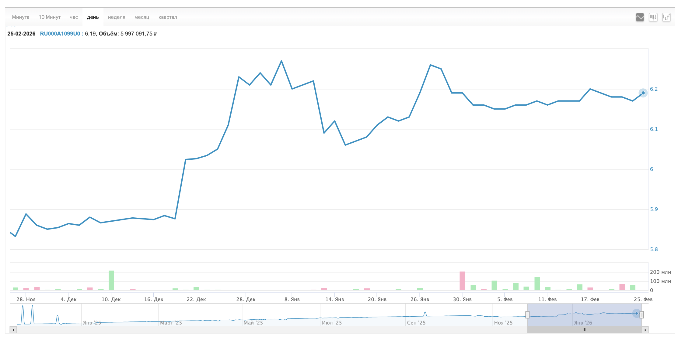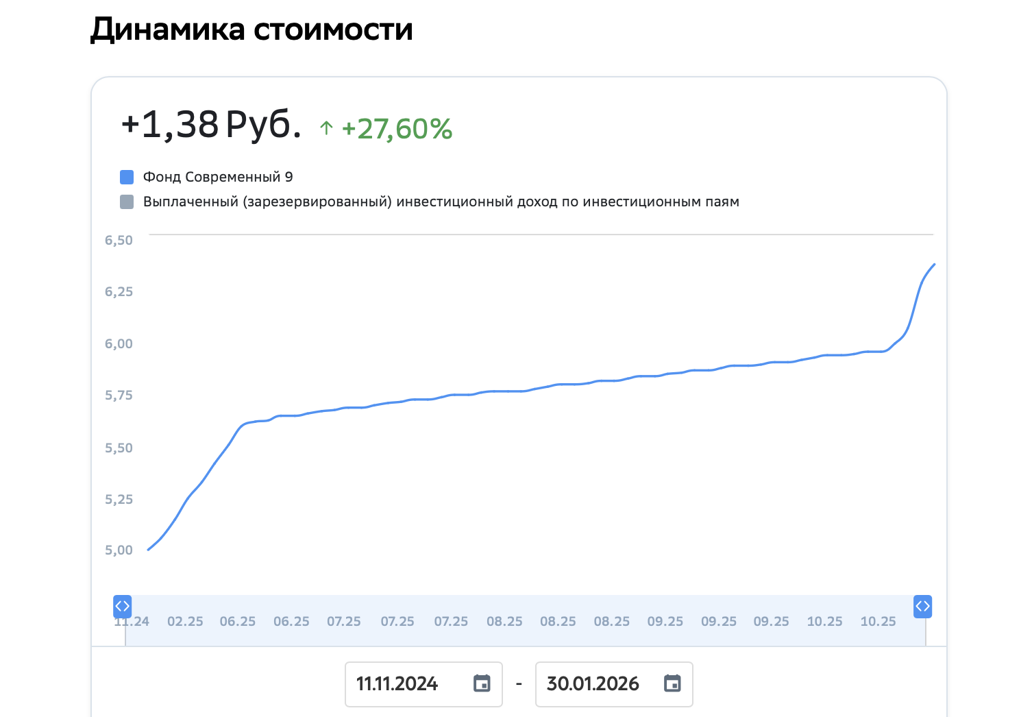 На момент написания обзора (февраль 2026 г.) информация о выплатах отсутствует. Можно оценить изменение стоимости пая, это значение выросло на 27,6% за 15 месяцев.
